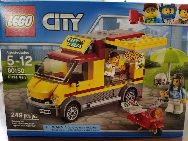 The LEGO 60150: Pizza Van set comes with 249 pieces including a pair of minifigures, a scooter, a small picnic table, and (of course), a pizza van.
